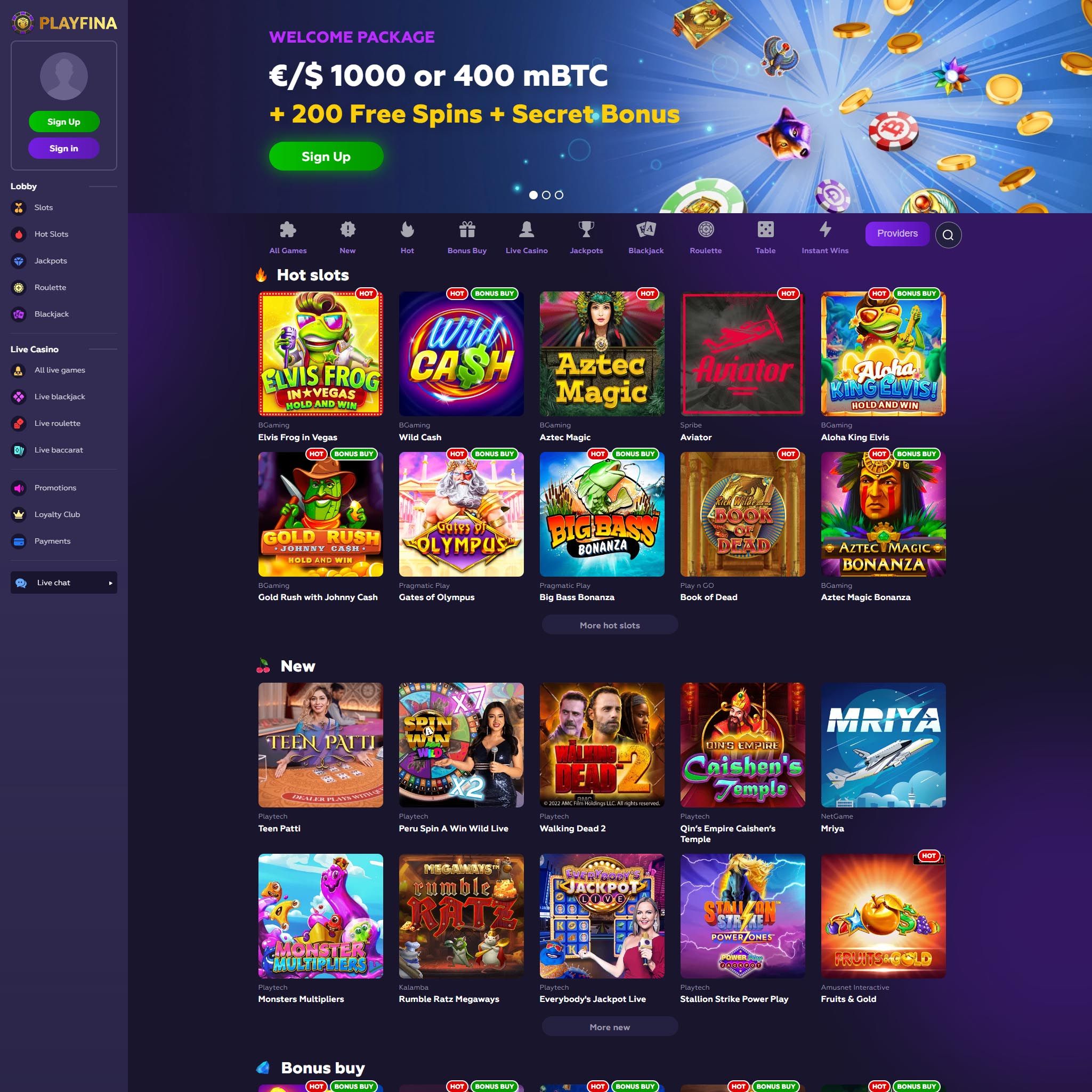 Visit the Playfina casino website or open the mobile app.